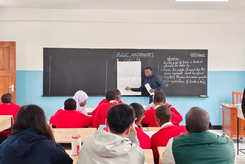 On July 23, the Delegation and the Volunteer Team visited Enaboishu English Medium Primary School, where teachers and students warmly welcomed them with drum music. During the teaching observation session, Gerald Lazaro Ngerenza, a teacher at the school, delivered a lesson titled Calculating the Surface Area of a Cylinder. Through physical models and paper-cutting demonstrations, he transformed abstract concepts into intuitive operations, demonstrating an innovative design integrating hands-on experiments and visualization strategies, which was highly recognized by both Chinese and Tanzanian teachers. On the afternoon of the same day, the Volunteer Team moved to Arusha Secondary School, where Emanuel Geoffrey Mweta, a mathematics teacher at the school, delivered a lesson titled Theorem of Inscribed Angles Subtended by the Same Arc. Integrating diagram demonstrations and heuristic questioning, the lesson not only emphasized the rigor of knowledge logic but also stimulated students’ thinking participation, achieving good classroom interaction and high goal attainment, which reflected the local teacher’s practical ability in geometry teaching. After the class, Chinese and Tanzanian teachers divided into groups to conduct in-depth teaching research based on the key elements of the classroom observation checklist. Tanzanian teachers clarified core teaching strategies and reflected on their practices, stating that they had gained substantial insights. This teaching research dialogue, lasting over an hour, promoted the collision of different educational concepts and laid a foundation for sustained collaboration and professional growth between the two sides.