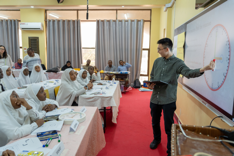 On July 21, a Delegation from UNESCO TEC and SHNU (hereafter referred to as the Delegation) and the Volunteer Team were invited by MoEVT to attend a welcome ceremony hosted by MoEVT, with the presence of several local education administrative officials. Mr. Hamis Abdalla Said, Permanent Secretary of MoEVT, delivered a welcome speech on behalf of the Zanzibari side, highly affirming the active participation of the International STEM Education Volunteer Team in the program and expressing sincere gratitude to the Shanghai Municipal Government for its long-term strong support. Professor Zhang Minxuan, Director of UNESCO TEC, recognized Tanzania’s long-term goals for educational development, put forward suggestions for the Zanzibari side’s education reform and development, and elaborated on the significance of the China-Tanzania mathematics teacher exchange program. After the welcome ceremony, the Delegation and the Volunteer Team, accompanied by school officials, visited Tumekuja Secondary School to tour the campus and inspect the operation of the smart classroom donated by a Chinese enterprise. Subsequently, on behalf of UNESCO TEC, Professor Zhang Minxuan donated the Share Maths (Shared Tree) series of teaching resources to representatives of Tanzanian teachers. On the afternoon of the same day, Gu Yuanhao, a mathematics teacher from the International Division of Fudan University Affiliated High School, delivered another mathematics lesson themed Geometric Transformations: Rotations in the smart classroom of Tumekuja Secondary School. Building on the previous use of ICT features in the smart classroom, this lesson further focused on visualizing the concept of rotation and enhancing the effectiveness of teacher-student interaction in the classroom. During the TRG activity, Teacher Gu Yuanhao reflected on his teaching, systematically reviewing the design ideas and practical highlights of the lesson, and shared his experiences regarding student participation and technology application in the classroom.