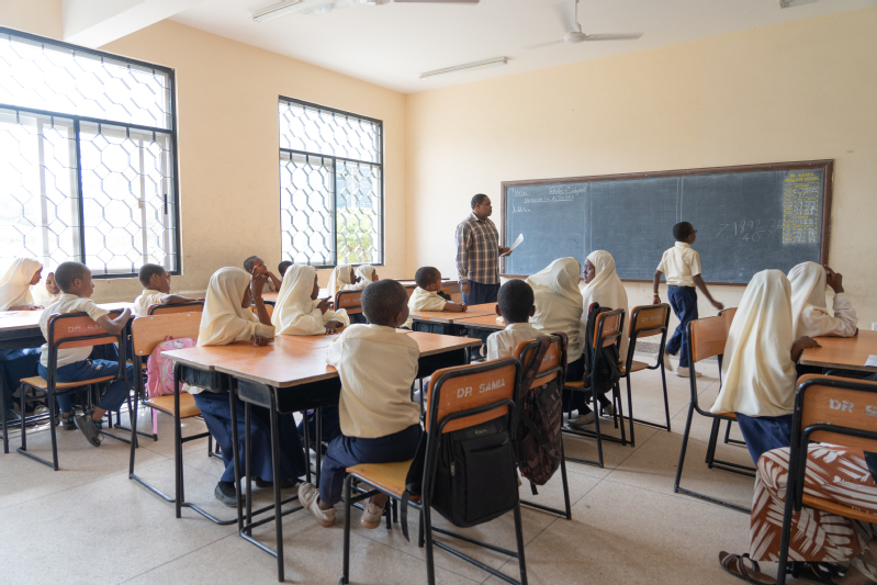 Starting from July 15, the Volunteer Team began implementing various official visits, teaching and research activities, and interview-based research in accordance with the pre-planned schedule. On the morning of the same day, the team visited the Ministry of Education and Vocational Training, Zanzibar (MoEVT), where they were warmly received by local education officials. During the seminar, Abdalla Mussa, Executive Director of the Zanzibar Institute of Education, introduced the local education system, teacher workforce development, and key priorities of curriculum reform; Dr. Shen Yihua, STEM education expert of the Volunteer Team, elaborated on the Shanghai-Tanzania Mathematics Teacher Professional Development Program; and Zhang Yunji, a doctoral student, focused on introducing the Teaching Research Group (TRG) mechanism in China’s basic education and the practical experience of previous volunteer teams. The Tanzanian side highly recognized the significance of the China-Tanzania cooperation program, and the two sides held in-depth exchanges on topics such as curriculum reform, hoping that this exchange would promote in-depth integration of teacher experiences between the two countries and solidify the implementation of educational cooperation. On the afternoon of July 15, the Volunteer Team visited Dr. Samia Primary School to conduct campus tours and teaching observations. Received warmly by the principal and greeted by students, the team learned about the school’s basic situation. Subsequently, Hafidh Ame Sheha, a mathematics teacher at the school, delivered a mathematics lesson themed Addition of Five-Digit Numbers. After the class, members of the Volunteer Team joined small groups of local Tanzanian teachers to conduct in-depth discussions on the design of teaching tasks, organization of student activities, and effectiveness of classroom interaction for this lesson.