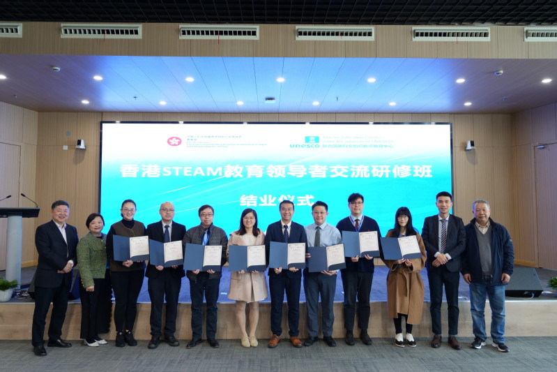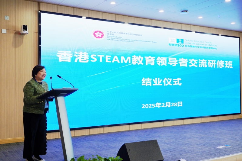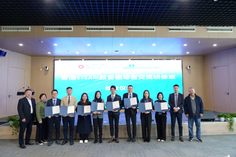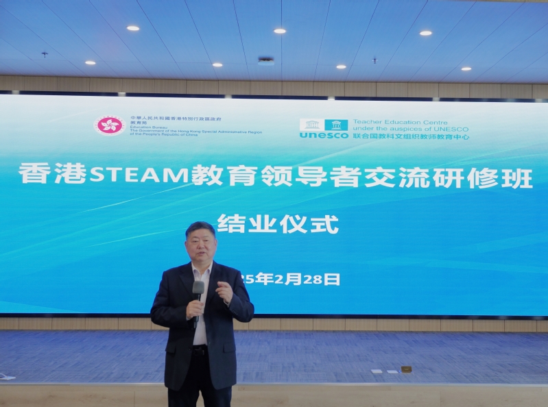On the morning of February 28, 2025, the closing ceremony of the Hong Kong STEAM Education Leaders Exchange and Training Program was successfully held at the UNESCO Teacher Education Centre (TEC). Attendees included Ms. Hung Lai-ting, Chief Curriculum Development Officer (Primary School-based Curriculum Development) of the Education Bureau of the Government of the Hong Kong Special Administrative Region of the People's Republic of China; Mr. Tse Pan-lun, Senior Curriculum Development Officer (Science); Mr. Tong Wai-ming, Curriculum Development Officer (Science); Professor Zhang Minxuan, Director of TEC; and 32 primary and secondary school principals and teachers from Hong Kong. The ceremony was chaired by Professor Hu Guoyong.