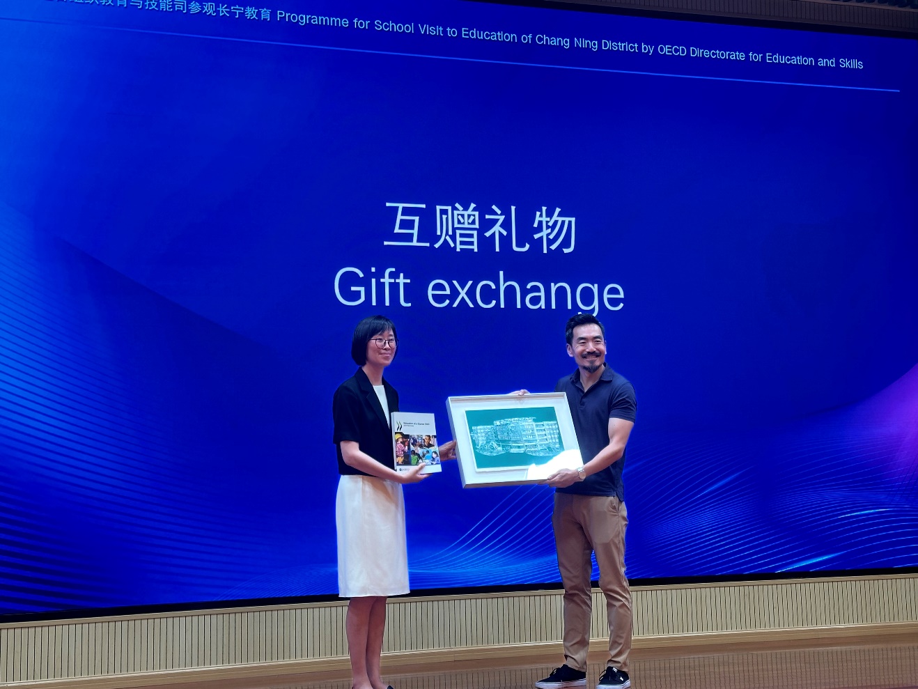 On July 5, TGB representatives from various countries visited Shanghai Jianqing Experimental School to participate in activities featuring school tours and discussions on digital empowerment for teacher development in Changning District. The seminar was chaired by Professor Zhang Minxuan from the Centre. At the seminar, Gu Jieyan, Deputy District Mayor of Changning District, delivered a speech and welcomed the visit of the OECD Directorate for Education and Skills. The two sides exchanged gifts. Zhang Jin, Deputy Director of the Personnel Division of the Shanghai Municipal Education Commission, introduced the general situation of basic education teacher team building in Shanghai. Jiang Ming, Deputy Director of the Shanghai Teacher Education Institute, gave a special introduction to digital empowerment for teacher resource allocation. Xiong Qiuju, Director of the Changning District Education Bureau, delivered a keynote report, systematically introducing the regional practices of Changning District in promoting the digital transformation of education. Luo Yufeng, Principal of Jianqing Experimental School, explained how the smart management service platform for teachers supports the professional growth of every teacher in the school. Xia Xiajuan, Deputy Director of the Changning District Education Bureau, and leaders from relevant departments of the Education Bureau attended the event. During the seminar, many TGB representatives and OECD officials spoke and raised questions, engaging in lively and in-depth interactive discussions.