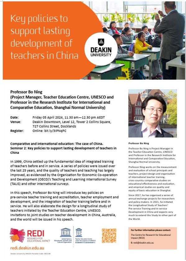 Dialogue and cooperation with developed countries are an important part of the Centre’s capacity building. During the 2023 Belt and Road project, the Centre, together with Linda Hobbs, Associate Dean of the Faculty of Education at Deakin University (Australia), co-hosted an online forum on Capacity Building for Teachers Teaching Outside Their Subject Areas, which attracted many peers from developed countries to present their academic research results. During the visit to Deakin University, the Centre’s delegation exchanged views on cooperation topics such as STEM teacher training, the development of international master's programs in education, and joint doctoral training. Professor Zhang Minxuan and Professor Ningbo delivered academic speeches on teacher education on behalf of the Centre.