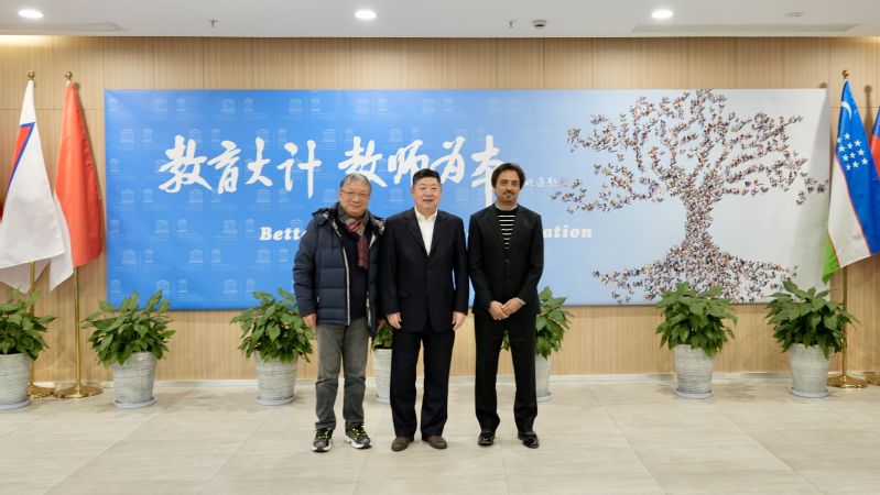 (Professor Zhang Minxuan, Director of the Centre; Mr. Sanaullah Panezai (Pan Sina), Director of the Education Section at UNICEF China; and Professor Shi Weiping, Honorary Director and Lifetime Professor of the Institute of Vocational and Adult Education, East China Normal University)