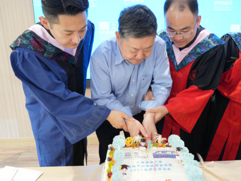 Following the speeches, Professor Zhang Minxuan presented graduation gifts to each graduate and joined Wang Chao, a doctoral graduate representative, and Cao Shengwen, a master’s graduate representative, in cutting a cake to celebrate the graduates’ promising future and happy graduation.