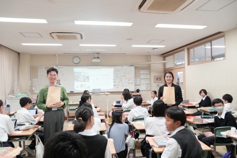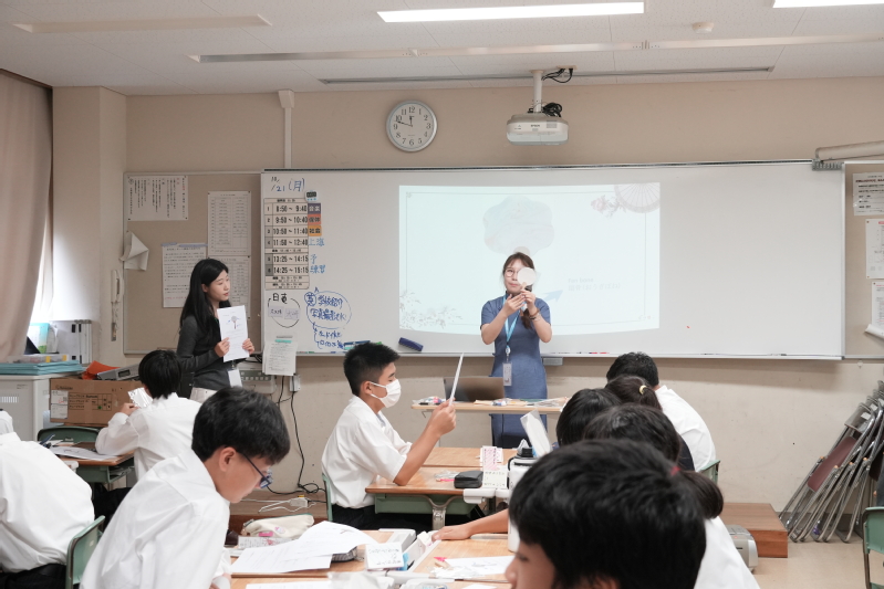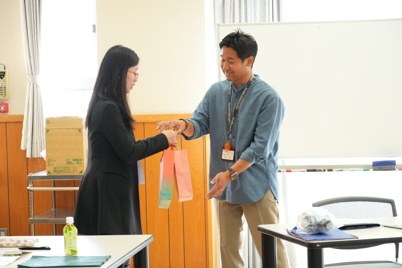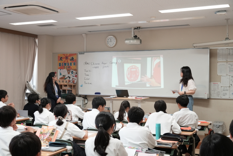 After the observations, the graduate students from our institute, in pairs, taught three Chinese traditional culture courses to three first-grade classes at Momoyama Junior High School, featuring cross-cultural teaching. The team of Cheng Jialei and Zhu Jiawen conducted a course on Traditional Chinese Paper-cutting Art, cleverly integrating the mathematical concept of axial symmetry into paper-cutting activities, which fully aroused students’ interest in Chinese traditional culture through on-site practice. Feng Yuan and Shi Chenying’s team taught The 24 Solar Terms of China to the second class, using music, pictures, and classroom games to stimulate students’ imagination about the solar terms. Jia Yun and Ma Yining’s course, Suzhou Lacquer Fan Art of China, introduced the history, types, and functions of Chinese lacquer fans with rich illustrations, and let students experience the charm of traditional Chinese craftsmanship through hands-on fan-making activities. After class, Japanese students introduced their class characteristics and presented hand-made paper cranes and other gratitude gifts to the teaching teams.