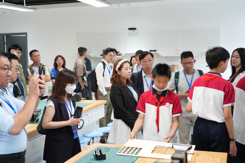 At High School Affiliated to ShanghaiTech University, participants first visited indoor and outdoor venues such as students' art exhibitions and the school's personalized learning spaces under the guidance of Mr. He Yangdong from the school office, interacting with teachers and students on site. Later, Mr. Zeng Guoguang, Principal and Deputy Secretary of the Party General Branch, and Ms. Li Bibo, Secretary of the Party General Branch, organized a discussion between the school's teachers and program participants. Participants listened to Principal Zeng's detailed explanation of the school's operation, educational goals and philosophy, and exchanged experiences, achievements, and teaching insights in STEAM education with the school's science faculty.