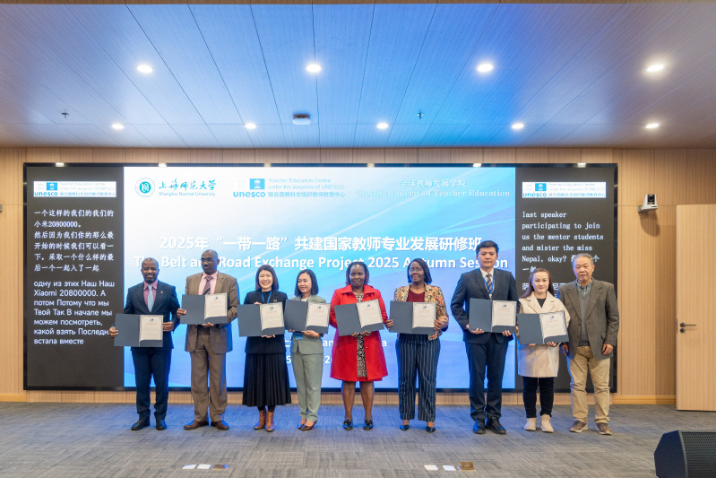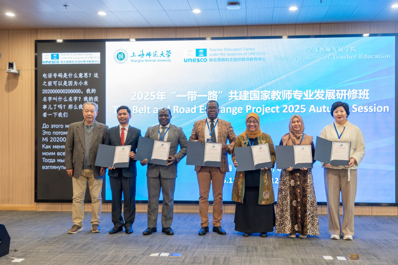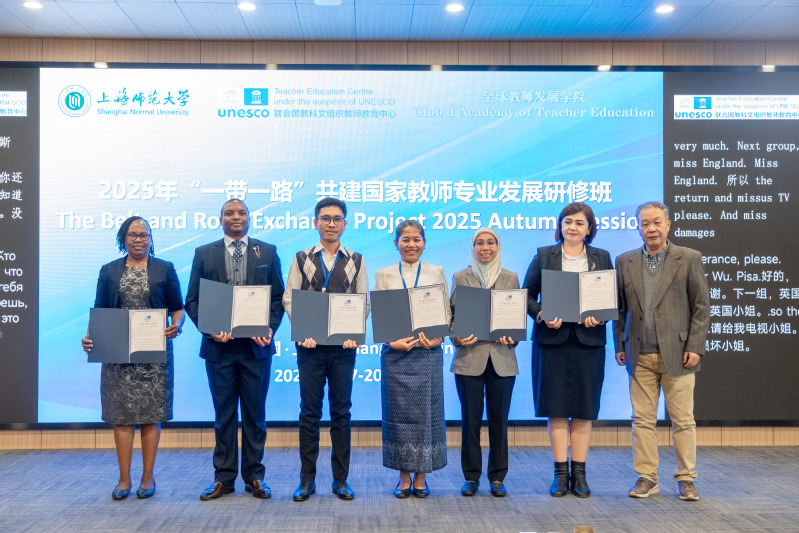 On December 8, 2025, the closing ceremony of the Belt and Road Exchange Project 2025 Autumn Session was held at the Shicheng Lecture Hall of the UNESCO Teacher Education Centre (TEC). Professor Zhang Minxuan, Director of TEC, Professor Hu Guoyong, Deputy Director of TEC, Professor Wang Jie, Deputy Director of the International Teacher Education Centre of Shanghai Normal University, as well as around 40 educational officials, teacher educators, experts, scholars and primary and secondary school teachers from 14 countries attended the ceremony. The closing ceremony was presided over by Professor Wang Jie.